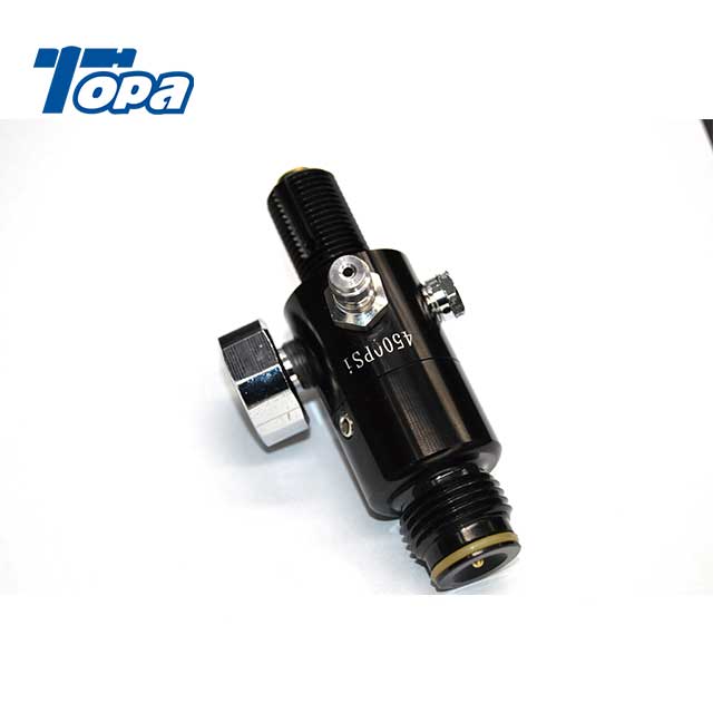 hpa regulator paintball Exterior is dark black anodized aluminum with a black Aluminum thread protector and a rubber fill nipple